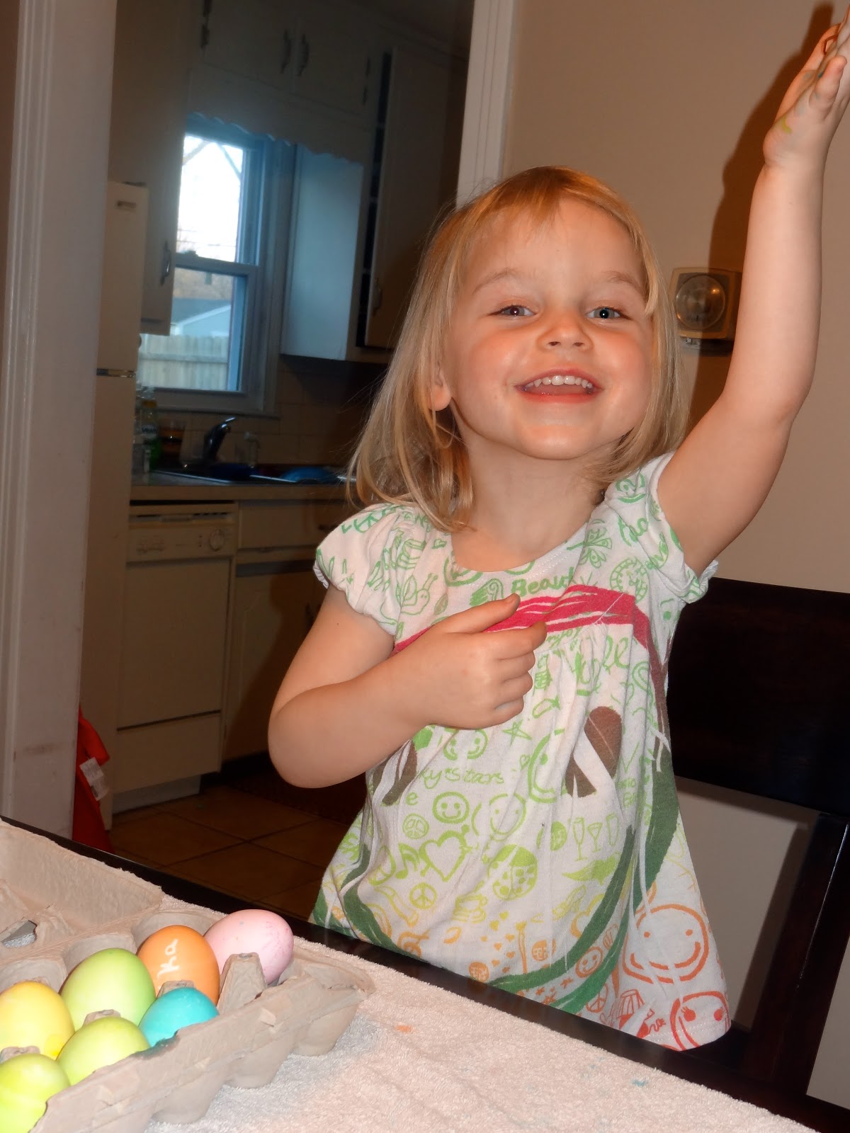Since Easter was close we boiled some eggs and got out the supplies to dye them. I wasn't sure what to expect this year. Last year we had a great time until the last egg, when she got dye all over her face. The year before that she was so little that everything was a mess. We had to scrub her in the tub right after just so her skin wouldn't stay blue. But this year she was a pro. She barley made a mess and even used a few different colors. She colored 12 and then was done. But she was sure proud of her 12. Asher tried to play with one egg, but he will have to wait until next year to really get into the fun. However, he did enjoy watching Annika. Sorry for the drool (and tiny bit of formula) on his shirt. If you are around him for very long, your clothes will look like that too.